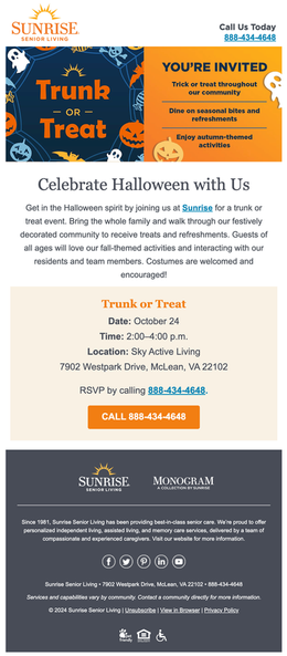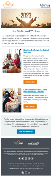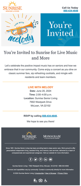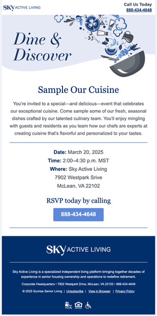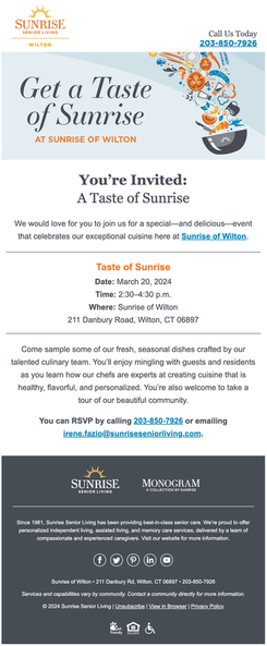 Sunrise Senior Living operates over 240 communities in the U.S., Canada, and the U.K., providing assisted living, memory care, and skilled nursing. My work supported their mission to deliver a warm, consistent brand experience across every email touchpoint—from community event invites to automated lead-nurture journeys.